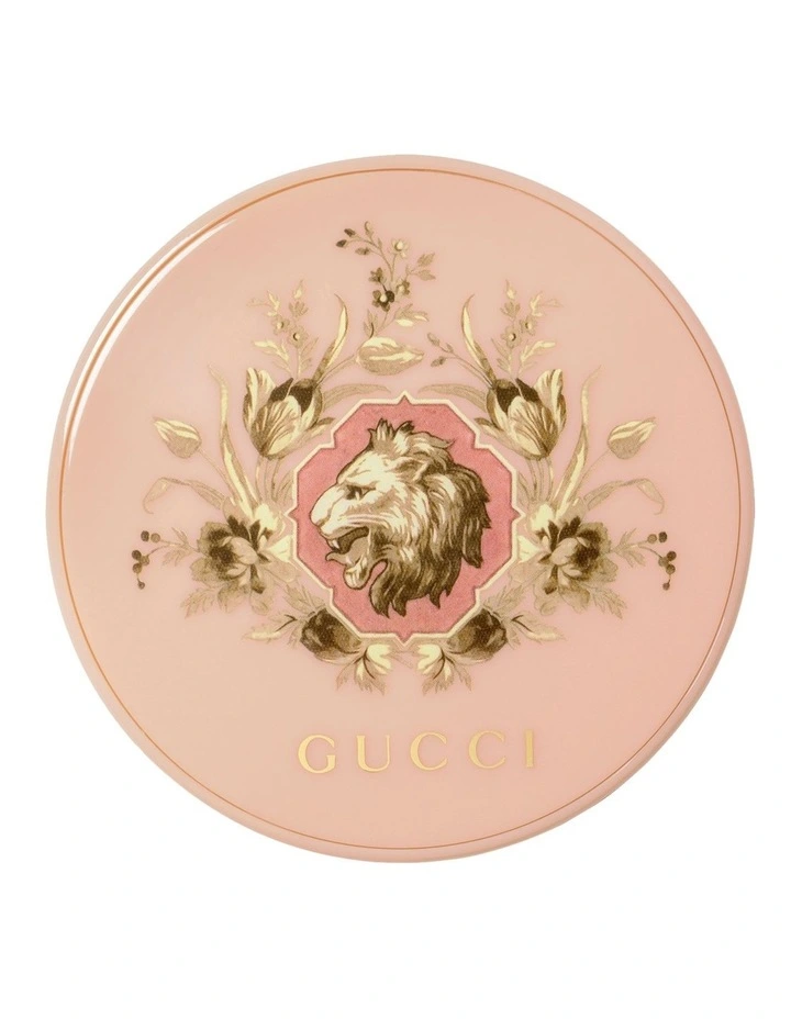 Available in six shades, Cushion De Beaute is encased within a refillable pastel pink compact, housed with a mirror and a soft cushion applicator. A distinctive Gucci design adorns the top of the round casing, which features a lion pattern surrounded by a wreath of flowers designed by Alessandro Michele. Desirable and playful, the outer packaging also features the same design.