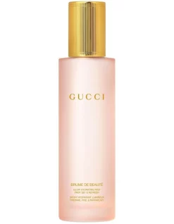 A beauty mist to prep, set or refresh the skin, Brume De Beaut is a hybrid product formulated with soothing and protective ingredients, as well as hydrating properties for up to 48 hours. Helping to shield skin from pollution, it can be used to hydrate the face for a glowing skin finish before, during or post makeup wear. Multi-use and unisex, use it to prepare skin for makeup, set the final look or refresh it in a cloud of hydration at any time during the day. The Formula and Application Gucci Beautys signature Black Rose Oil is the formulas secret ingredient, creating the mists soothing and antioxidant properties. Infused with Hyaluronic Acid, the mist provides skin with hydration and a healthy-looking glow while a blend of film-forming actives help set makeup. From preparing the skin to perfecting and maintaining a fresh face throughout the day, Brume De Beaut is a mist that does it all. The Design and Range Housed within a transparent pastel pink glass bottle and finished with a gold trim, Brume De Beaut looks beautiful in any makeup bag or on any dresser and is available in one universal formula. Additionally, the pump provides a lightweight cloud of mist for a comfortable application and a moment of self-cherishing.